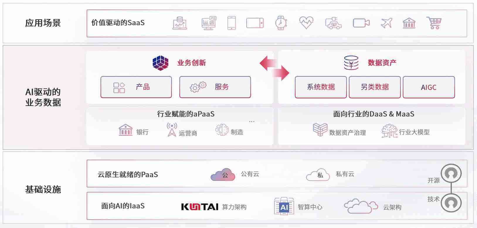 在基础设施层面,,,基于商业或开源的云原生就绪开发工具与技术组件(PaaS)和面向AI的底层公共基础设施资源(IaaS),,将共同支撑企业完成数字化转型
