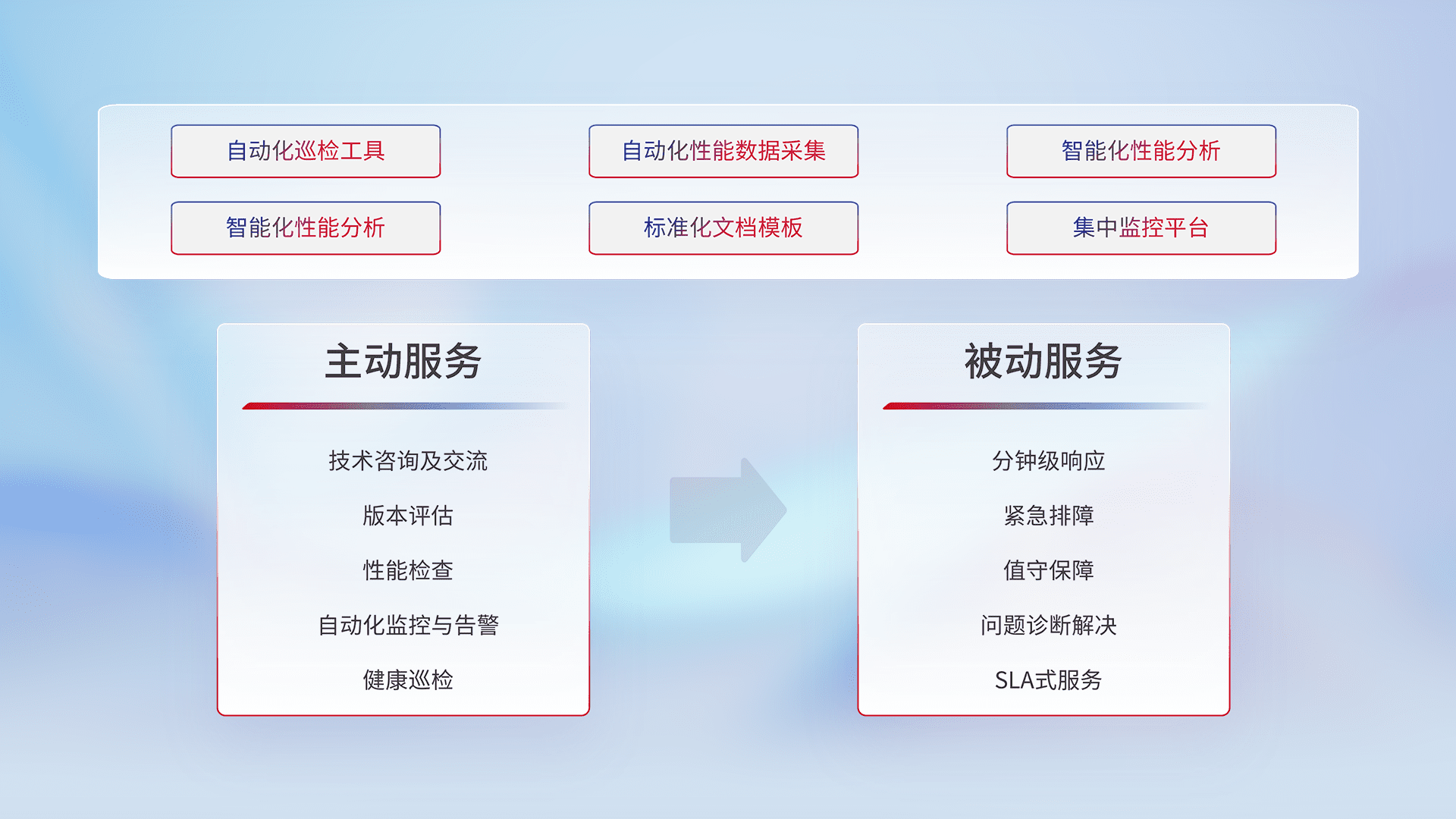 智能化工具和标准化文档,,,,保障服务质量,,提供主动服务(包含技术咨询、、版本评估、、、性能检查、、、自动化监控与告警、、、健康巡检)和被动服务包含(分钟级响应、、、紧急排障、、值守保障、、、问题诊断解决、、、、SLA服务)。。
